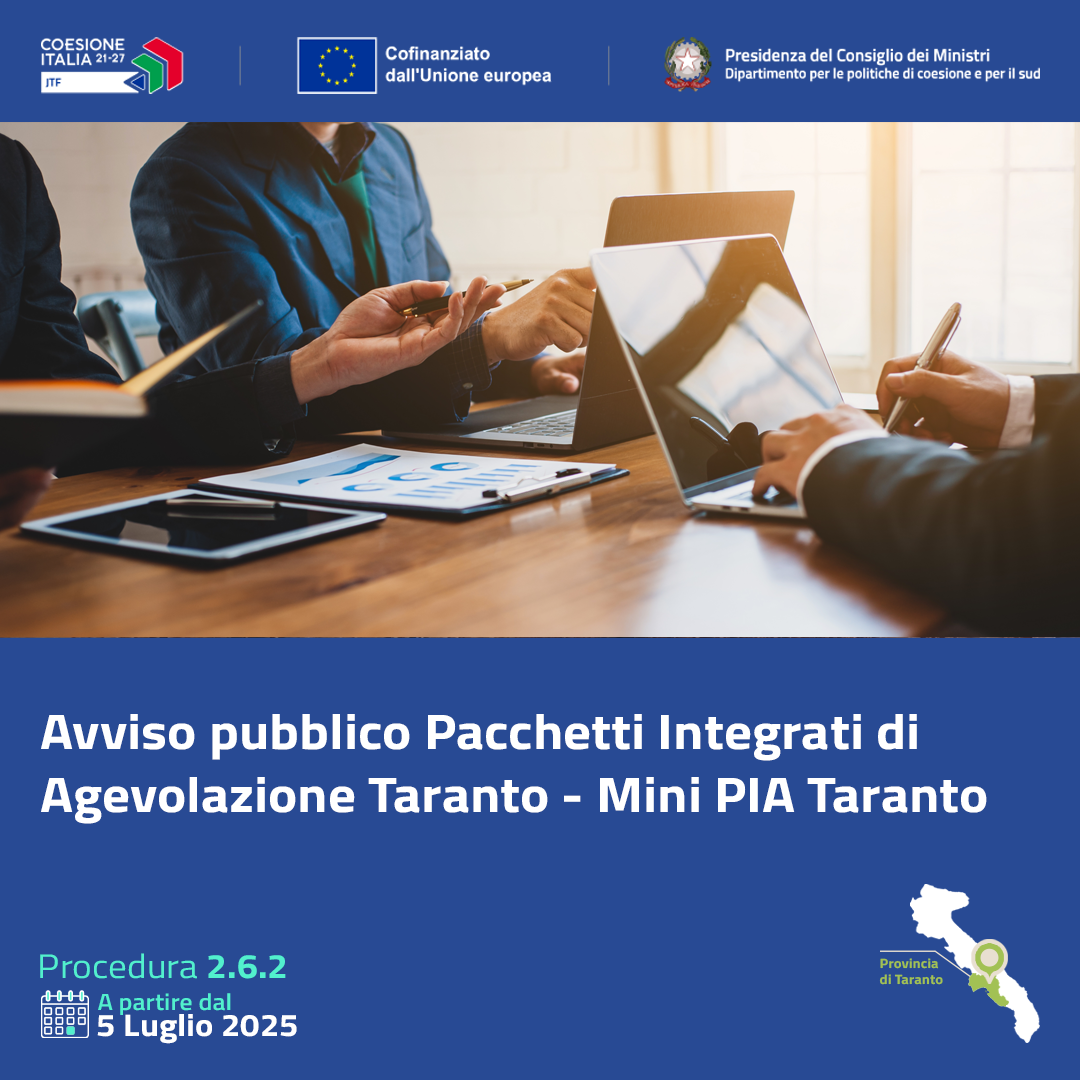 Pubblicato l’Avviso “Mini PIA Taranto” per il sostegno alle micro e piccole imprese della provincia di Taranto